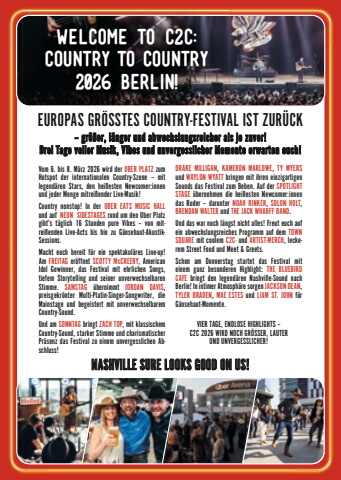 Vom 6. bis 8. M%u00e4rz 2026 wird der UBER PLATZ zum Hotspot der internationalen Country-Szene %u2013 mit legend%u00e4ren Stars, den hei%u00dfesten Newcomer:innen und jeder Menge mitrei%u00dfender Live-Musik!Country nonstop! In der UBER EATS MUSIC HALLund auf NEUN SIDESTAGES rund um den Uber Platz gibt%u2019s t%u00e4glich 16 Stunden pure Vibes %u2013 von mitrei%u00dfenden Live-Acts bis hin zu G%u00e4nsehaut-AkustikSessions.Macht euch bereit f%u00fcr ein spektakul%u00e4res Line-up!Am FREITAG er%u00f6ffnet SCOTTY McCREERY, American Idol Gewinner, das Festival mit ehrlichen Songs, tiefem Storytelling und seiner unverwechselbaren Stimme. SAMSTAG %u00fcbernimmt JORDAN DAVIS, preisgekr%u00f6nter Multi-Platin-Singer-Songwriter, die Mainstage und begeistert mit unverwechselbarem Country-Sound.Und am SONNTAG bringt ZACH TOP, mit klassischem Country-Sound, starker Stimme und charismatischer Pr%u00e4senz das Festival zu einem unvergesslichen Abschluss!DRAKE MILLIGAN, KAMERON MARLOWE, TY MYERS und WAYLON WYATT bringen mit ihren einzigartigen Sounds das Festival zum Beben. Auf der SPOTLIGHT STAGE %u00fcbernehmen die hei%u00dfesten Newcomer:innen das Ruder %u2013 darunter NOAH RINKER, SOLON HOLT, BRENDAN WALTER und THE JACK WHARFF BAND.Und das war noch l%u00e4ngst nicht alles! Freut euch auf ein abwechslungsreiches Programm auf dem TOWN SQUARE mit coolem C2C- und ARTIST-MERCH, leckerem Street Food und Meet & Greets.Schon am Donnerstag startet das Festival mit einem ganz besonderen Highlight: THE BLUEBIRD CAFE bringt den legend%u00e4ren Nashville-Sound nach Berlin! In intimer Atmosph%u00e4re sorgen JACKSON DEAN, TYLER BRADEN, MAE ESTES und LIAM ST. JOHN f%u00fcr G%u00e4nsehaut-Momente. VIER TAGE, ENDLOSE HIGHLIGHTS %u2013C2C 2026 WIRD NOCH GR%u00d6SSER, LAUTER UND UNVERGESSLICHER!EUROPAS GR%u00d6SSTES COUNTRY-FESTIVAL IST ZUR%u00dcCK%u2013 gr%u00f6%u00dfer, l%u00e4nger und abwechslungsreicher als je zuvor! Drei Tage voller Musik, Vibes und unvergesslicher Momente erwarten euch!NASHVILLE SURE LOOKS GOOD ON US!EUROPAS GR%u00d6SSTES COUNTRY-FESTIVAL IST ZUR%u00dcCKWelcome to C2C: Country to Country 2026 Berlin!
