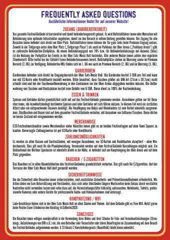ZUGANG (BARRIEREFREIHEIT)Das gesamte Festival-Gel%u00e4nde ist barrierefrei und damit behindertengerecht gebaut. Es wird Rollstuhlfahrer:innen oder Menschen mit Behinderung eine optimale Infrastruktur angeboten, damit sie den Besuch in vollem Umfang genie%u00dfen k%u00f6nnen. Der Zugang f%u00fcr alle Besucher:innen befi ndet sich direkt am Uber Platz. Rollstuhlfahrer:innen k%u00f6nnen die T%u00fcr ganz links beim Premium Eingang nutzen. Sowohl in der Tiefgarage unter dem Uber Platz (%u201eTiefgarage Plaza%u201c) als auch im Parkhaus der Uber Arena (%u201eParkhaus Arena%u201c) gibt es zahlreiche Behinderten-Stellpl%u00e4tze. Ab einem Behinderungsgrad von 70% bzw. f%u00fcr Behindertenfahrzeuge mit Ausweis (blau) ist die Nutzung der Parkpl%u00e4tze bei Events in der Uber Eats Music Hall kostenlos. Alle anderen Nutzer:innen zahlen den regul%u00e4ren Stundentarif. Bitte haltet bei der Einfahrt Euren Behindertenausweis bereit. Rollstuhlpl%u00e4tze stehen im Oberrang sowie im Premium Bereich (2. OG) zur Verf%u00fcgung. Behinderten-WCs fi nden sich im 1. OG wie auch im Premium Bereich (2. OG) und im Oberrang (3. OG).GARDEROBENGarderoben befi nden sich direkt im Eingangsbereich der Uber Eats Music Hall. Die Garderobe kostet 3 EUR pro Teil und kann nur mit EC-Karte oder Kreditkarte bezahlt werden. Bitte beachtet, dass Taschen gr%u00f6%u00dfer als DIN A4 (21cm x 29,7cm) nicht erlaubt sind und bei der Taschenaufbewahrung in den Containern vor der Uber Arena abgegeben werden m%u00fcssen. Die Aufbewahrung von Taschen und Rucks%u00e4cken kostet eine Geb%u00fchr von 6 EUR. Diese dient zu 100% der Kostendeckung. ESSEN & TRINKENSpeisen und Getr%u00e4nke d%u00fcrfen grunds%u00e4tzlich nicht mit auf das Festival-Gel%u00e4nde genommen werden. Ausnahmen gelten nur f%u00fcr Besucher:innen, die krankheitsbedingt bestimmte Speisen und/oder Getr%u00e4nke mit sich f%u00fchren m%u00fcssen. In diesem Fall wird ein %u00e4rztliches Attest oder ein entsprechender Ausweis ben%u00f6tigt. Die Verpfl egung von Babys und Kleinkindern ist vom Verbot ebenfalls ausgenommen. Glasfl aschen und Dosen sind auf dem gesamten Festival-Gel%u00e4nde verboten, mit Ausnahme von faltbaren Flaschen. Diese d%u00fcrfen im leeren Zustand mit reingenommen werden.MERCHANDISEC2C-Festivalmerchandise sowie Merchandise vieler K%u00fcnstler:innen gibt es an beiden Festivaltagen auf dem Town Square zu kaufen. Bevorzugte Zahlungsweise ist per EC-Karte oder Kreditkarte.ZAHLUNGSM%u00d6GLICHKEITENEs werden an allen Kassen und Gastrost%u00e4nden, mit wenigen Ausnahmen, nur EC-Karten und Kreditkarten akzeptiert %u2013 ohne Mindestumsatz. Dies gilt auch f%u00fcr die Pfandabwicklung. Vereinzelnd werden auf dem Festival-Gel%u00e4nde Barzahlungen m%u00f6glich sein. Ein Geldautomat der Berliner Sparkasse ist ebenfalls direkt in der N%u00e4he, er befi ndet sich am Haupteingang der Uber Arena und auf dem Platz gegen%u00fcber.RAUCHEN / E-ZIGARETTENDas Rauchen ist in allen R%u00e4umlichkeiten des Festival-Gel%u00e4ndes grunds%u00e4tzlich verboten. Das gilt auch f%u00fcr E-Zigaretten. Auf der Terrasse der Uber Eats Music Hall darf geraucht werden.SICHERHEITSHINWEISEUm die Sicherheit aller Besucher:innen sicherzustellen, sind zus%u00e4tzliche Sicherheits- und Pr%u00e4ventionsma%u00dfnahmen erforderlich. Wir bitten daher um Eure Unterst%u00fctzung und Verst%u00e4ndnis, dass sich unter Umst%u00e4nden l%u00e4ngere Wartezeiten beim Einlass durch verst%u00e4rkte Kontrollen nicht vermeiden lassen und rufen dazu auf, die Veranstaltungsst%u00e4tte fr%u00fchzeitig aufzusuchen. Notebooks, Tablets, professionelle Kameras oder andere Ger%u00e4te f%u00fcr professionelle Audio- und Videoaufnahmen sind untersagt.HANDYNUTZUNG / WIFILade-Anschl%u00fcsse fi nden sich in der Uber Eats Music Hall an allen S%u00e4ulen und Theken. Auf dem Gel%u00e4nde gibt es Free Wifi . Nutzt gerne beim Posten Eurer Erlebnisse den Hashtag #c2cBerlin2026SONSTIGESDie Besucher:innen willigen unwiderrufl ich in die Verwendung ihres Bildes und ihrer Stimme f%u00fcr Foto- und Fernsehaufzeichnungen (Streamings, Aufzeichnungen von DVD o.%u00c4.) ein, die vom Betreiber oder Veranstalter oder deren Beauftragten im Zusammenhang mit dem Besuch des Festival-Gel%u00e4ndes aufgenommen werden. %u00a7 23 Absatz 2 Kunsturhebergesetz (KunstUrhG) bleibt davon unber%u00fchrt.FREQUENTLY ASKED QUESTIONSAusf%u00fchrliche Informationen fi ndet Ihr auf unserer Website!