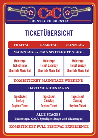 FREITAG SAMSTAGKOMBITICKET MAINSTAGE WEEKENDALLE STAGES(Mainstage, CMA Spotlight Stage und Sidestages)Mainstage Ticket SaturdayUber Eats Music HallMainstage Ticket FridayUber Eats Music HallMainstage Ticket SundayUber Eats Music HallTagesticket SamstagDaytime TicketTagesticket FreitagDaytime TicketKOMBITICKET FULL FESTIVAL EXPERIENCETagesticket SonntagDaytime TicketSONNTAGTicketUbersichtDAYTIME SIDESTAGESMAINSTAGE + CMA SPOTLIGHT STAGE